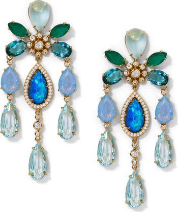 Dramatic floral chandelier earrings drench you in sparkle with dainty cubic zirconia contrasting bold, mixed-cut crystal drops in an array of serene hues.