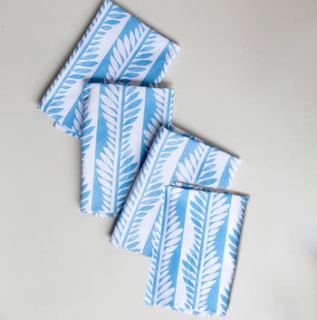 We love block prints and wanted to create a modern take on this print with our vine print. This 2 color, hand-painted artwork is perfect for any tablescape. These napkins are printed in India in small batches. This set of four organic napkins is great for all your entertaining needs. The cool blue color is seasonless and is perfect as a hostess gift. About this product: Set of four napkins: size: 18”x 18” Material: GOTS-certified organic cotton Small batch made in India Machine washable Original Artwork by Gabrielle Mandel