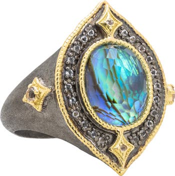 A blue mother-of-pearl doublet brings a nautical luster to this antique-inspired ring featuring a blackened patina and morganite halo.