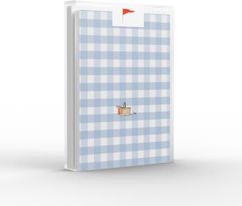 This 8-pack of greeting cards is elegantly illustrated by artist Ingrid Ramus, founder and owner of the Ramus & Co brand. Artwork features a picnic basket on blue gingham pattern. All greeting cards are made in the USA on heavyweight uncoated and locally-sourced and manufactured card stock. Each card is accompanied by a hand-embossed envelope made with heavyweight 95lb paper and a peel-and-stick flap - no licking envelopes here! All Ramus & Co. greeting cards are printed on FSC© and SFI© certified paper sourced from a regional mill that harnesses 66% of its energy from on-site sustainable sources, such as emission-free hydroelectricity and biomass co-generation from wood waste. All 8 greeting cards come packaged as a boxed set. Husband-and-wife team Calvin and Ingrid Ramus founded Ramus & Company in 2019, in New England, USA. Ingrid, the creative designer behind the brand, originates from Mexico, where she cultivated her skills in fashion and textile design. Drawing from her unique and inquisitive perspective on preppy style, Ingrid prolifically designs whimsical yet classic stationery and lifestyle items.