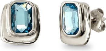 Rectangular sterling silver-plated earrings set with a striking blue faceted crystal.