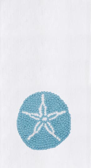 - The chenille-tufted teal sand dollar on a crisp white ground gives this dishtowel a clean, coastal elegance that pairs naturally with beach house, nautical, and everyday kitchen decors in farmhouse, contemporary, and transitional home settings.
