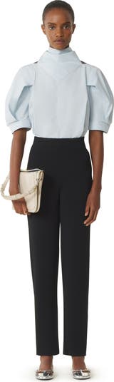 The volume of the shoulders on this top is achieved through asymmetrical pleats that create the illusion of a cape on the back. The high collar features a triangular scarf, inspired by Jeanne Lanvin's designs and one of the House's iconic signatures. The asymmetrical cuffs represent the designer's initials, with a rounded side for the J and a square side for the L. The cotton poplin fabric has a generous feel and helps avoid creases, to maintain a polished look all day long. It pairs perfectly with a pair of flowing pants for a soft, feminine look.