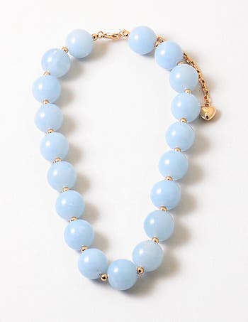 Bring a bold statement into your daily uniform with this chunky blue beaded necklace. This chic design features oversized sky blue colored beads with tiny gold spacer beads.