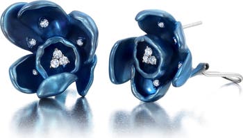 Gemstone: .25cts of G-H Color White Diamonds (14pcs) Metal: 18K Gold, 1.3 Grams & Titanium, 6g Colors: White Gold & Blue Titanium Measurements: 20.5mm Closure: Post & Omega