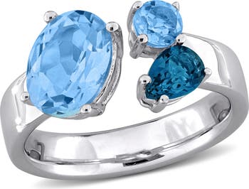 This vibrant open ring showcases a combination of multi blue topaz gemstones, all set in sterling silver. The large oval-cut sky-blue topaz is complemented by a pear-shaped London-blue topaz and a round-cut Swiss-blue topaz, creating a striking contrast of blue colors. The sterling silver adds a warm, luxurious touch to the design, making this ring a unique and stylish statement piece.