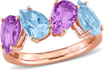 This vibrant ring showcases a combination of pink amethyst and blue topaz gemstones, set in rose-plated sterling silver. The pear-cut pink amethysts are complemented by pear-cut blue topaz gemstones, creating a striking contrast of bold colors. The rose-plated sterling silver adds a warm, luxurious touch to the design, making this ring a unique and stylish statement piece.