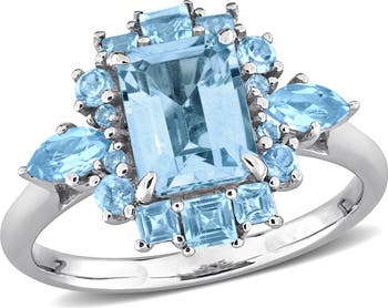 This exquisite halo ring showcases a combination of sky blue topaz and Swiss blue topaz set in a halo design crafted from 14k white gold. The sky blue topaz and Swiss blue topaz stones, known for their serene and vibrant blue hues respectively, create a captivating contrast within the halo setting. The halo of smaller stones enhances the brilliance and allure of the central gemstones, creating a dazzling display of color and sparkle. This ring is ideal for making a statement and adding a touch of glamour to any occasion, making it a treasured piece in any jewelry collection.