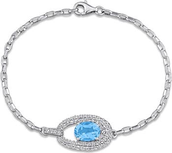 This beautiful bracelet is crafted in sterling silver and showcases an oval-cut blue topaz surrounded by round-cut white topaz gemstones in a lovely open halo design. This bracelet measures 7 inches in length and is enhanced with a high polish finish.