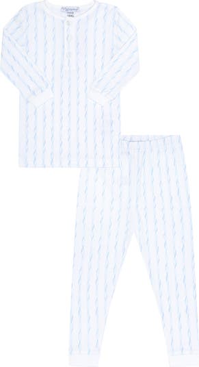 Made from luxurious 100% Pima cotton, these pajamas feature a delightful light blue twirl pattern that adds a touch of charm. The pajama top is designed with a pristine white collar and blue picot trim, along with three buttons on the front for added style. The pants also include matching blue picot trim at the ankles and an elastic waistband for a comfortable fit.
