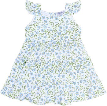 Made from 100% premium Pima cotton, this dress is as soft and comfortable as it is stylish. Featuring an all-over delicate blue vine floral print, flutter sleeves, and a flowy ruffled hem.