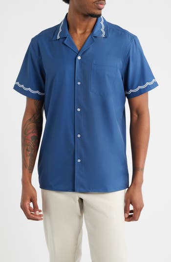 Lightweight and stretchy, this UV-blocking camp shirt made with recycled and coconut-husk fibers brings a crisp finish and smart comfort to any sunny-day look. Embroidered waves around the collar and cuffs enhance the relaxed, warm-weather feel, while quick-drying fabric helps keep you cool in the heat.