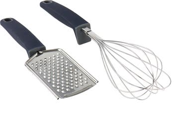 Be ready in the kitchen with this trusty Oster Bluemarine 2 Piece Stainless Steel Grater and Whisk Set. With ergonomic handles, your hand will be comfortable no matter how long you use these tools. The grater features a sharp stainless steel build so you can grate cheese and zest fruits with ease, and the whisk features sturdy tines to create smooth batters and perfect peaks. For all your cooking and baking needs, this fantastic whisk and grater set is just what you've been looking for!