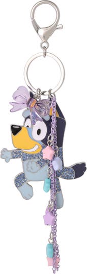 Officially Licensed Bluey Accessories: Heeler family fun! Bluey pendant features a liquid-filled purple bow, enamel plating, and blue pave crystals for eye-catching sparkle. Purple chain embellished with star charms also dangles from the keyring