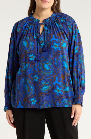 A lively floral print emboldens the look of this long-sleeve woven shirt embellished with tassel cords.