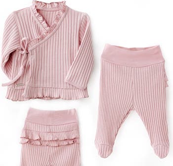 A cozy pairing for newborns, this soft ribbed set includes a wrap-style top and matching footed pants in a delicate rose hue—perfect for lounging or layering. Wrap top with side tie for easy dressing and gentle fit. Footed pants with wide waistband for all-day comfort.
