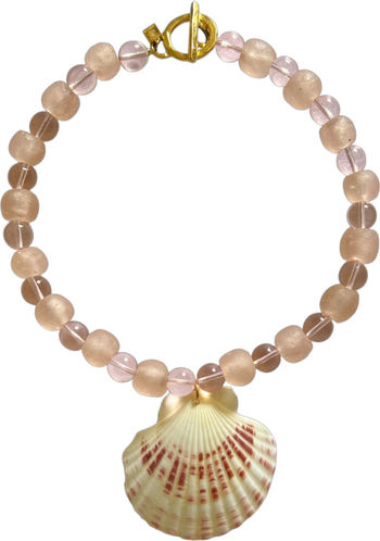 A necklace to take with you on all your beach days! Blush is 17" of vintage pink glass beads and a unique oversized pink and white seashell. Fitted with a 12k antiqued gold plated toggle clasp.