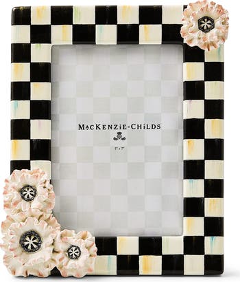 Dimensional blooms are paired with hand-painted checks in a picture frame set on an easel back.