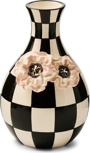 Charm any table or countertop with this hand-painted ceramic vase featuring signature Courtly Checks and two blush poppies accents.