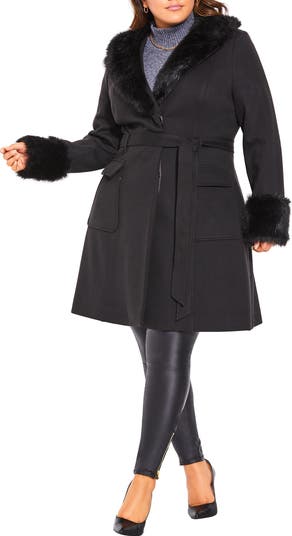 Celebrate the return of classic fit-and-flare silhouette in this twill coat with a waist-cinching tie belt and plush faux fur trimming the shawl collar and cuffs.