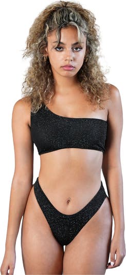 Introducing our one shoulder 'Blvck Glitter Swimsuit' in black lurex sparkle with matching high waist bottoms.