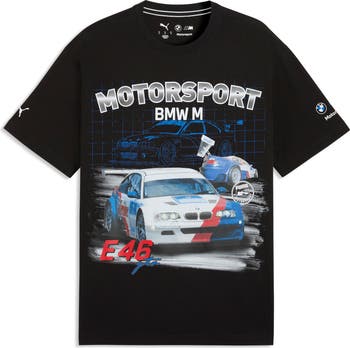Poster art celebrating the power of BMW's M3 E46 brings bold energy to a T-shirt made of breathable cotton and designed for easy drivability across your casual wardrobe. Let it rev up any favorite look whether you're doing circuits at the gym or making circuits around a social event.