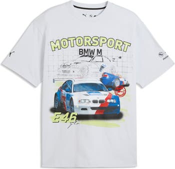 Poster art celebrating the power of BMW's M3 E46 brings bold energy to a T-shirt made of breathable cotton and designed for easy drivability across your casual wardrobe. Let it rev up any favorite look whether you're doing circuits at the gym or making circuits around a social event.