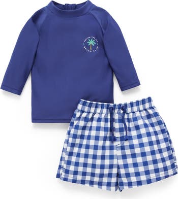 Have fun in the sun in our Board Short & Rashie Set! Featuring a matching long sleeved rashie and comfy printed board shorts. Designed with an elasticated waistband for comfort and easy dressing. Made from a recycled polyester and elastane blend for a lightweight and breathable swimwear option. Rashie made from 86% Recycled Polyester/14% Elastane with 100% Polyester Lining Shorts made from 100% Recycled Polyester. Purebaby Swim has been consciously designed with an awareness of our impact on the ocean and the environment. All styles are made from Repreve fabric, which is created using recycled post-consumer products and other ocean landfill.