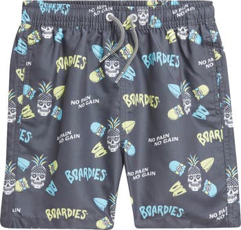 Four-way-stretch fabric with sun protection stays comfortable in the water and on land in kid-sized board shorts detailed with cool print.