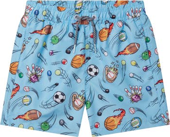 Your kiddo will score perfect beach-day style in these swim trunks crafted from quick-drying fabric with an exclusive print any sports lover will appreciate.