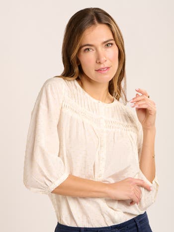 A timeless favourite. Our Boardwalk blouse features delicate dobby fabric, cuffed 3/4 sleeves, button front placket and pin tuck detailing, it’s lightweight, breathable, and perfect for warmer days. Pair it with denim or pants.