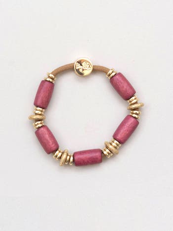 The BOARDWALK bracelet hair tie is sleek, modern, and effortlessly chic. Hand-strung with elongated mauve wood beads and stacked golden accents, it strikes the perfect balance between bold and minimal. Finished with By Lilla’s signature clasp, this versatile piece transitions seamlessly from polished bracelet to functional hair tie.