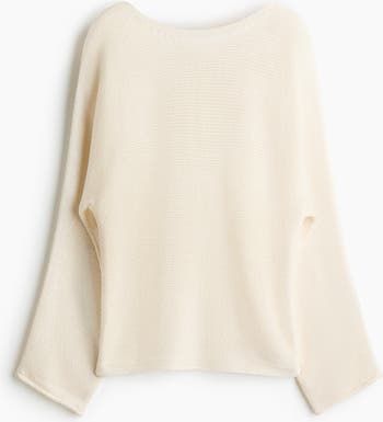 Jumper in a horizontal rib knit with a boat neckline and long sleeves with a roll edge at the cuffs.