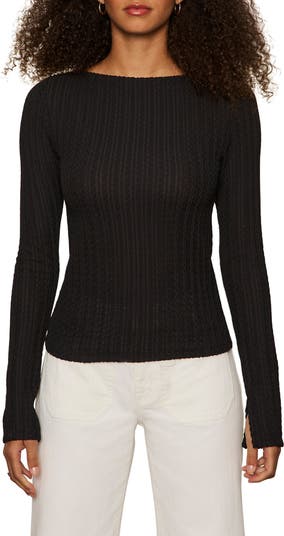 Update your casual look in this long-sleeve top made from a stretch-cotton blend and styled with eye-catching ribbing and an elegant boat neck.