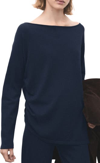 Here, the sweater takes a classic relaxed shape and refines it with a boat neck that opens up the shoulders. The asymmetric hem adds movement and a little attitude without losing the clean lines.