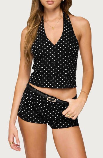 Bring an updated-pinup vibe to your warm-weather rotation with this flirty button-front halter top cut from stretch cotton with a retro polka dot print.