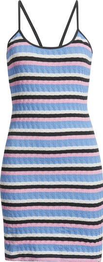 Soft towelling fabric adds texture to this shapely striped mini that complements a sunny day.