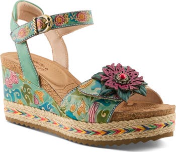 A jewel-centered floral appliqué and hand-painted leather bring artisanal charm to an espadrille-inspired sandal lifted by a jute-wrapped platform and wedge heel.