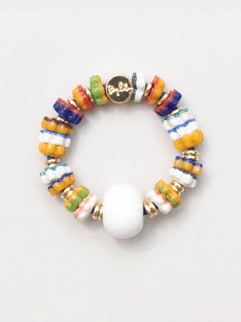 Lively, eclectic, and bursting with color — the BODEGA bracelet hair tie captures the vibrant spirit of city street corners and spontaneous finds. With multicolored stacked glass disc beads in hand-painted textures, pops of cobalt, mustard, green, and coral, and a bold matte white center bead, this piece is a wearable celebration of culture and creativity. Finished with gold filled spacers and By Lilla’s iconic clasp, it shifts seamlessly from statement bracelet to hair tie.