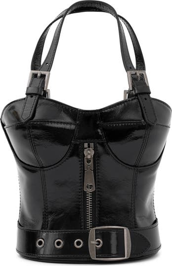 Bring the perfect bit of whimsy to your look with a patent-leather handbag that's structured to look like a sleek bodice.