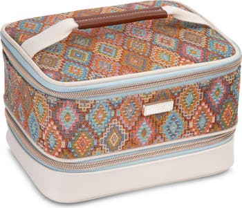 The spacious cosmetics case is designed with top and bottom storage compartments perfect for organizing essentials.