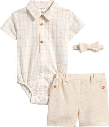 Your dapper little darling will be picture perfect in a matched set featuring a shirting bodysuit, sweet shorts and a polished pre-tied bow tie.