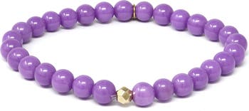 Pretty purple phosphosiderite beads line this stackable stretch bracelet handcrafted with a faceted 14-karat gold bead right in the center.