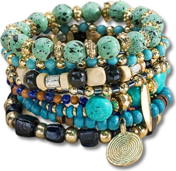 Color that grounds. Layers that tell a story. The Bohemian Stacking Bracelet Set is a celebration of texture, movement, and effortless expression. Eight stretch bracelets come together in a harmonious blend of turquoise hues, natural wood, glass, stone, and metallic beads—anchored by subtle gold-toned accents and a spiral charm that symbolizes growth and continuity.