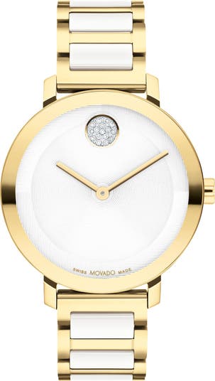 Minimalism makes a bold impact on this Swiss-powered watch featuring a wide face with polished hands, a high-shine border and a crystal-encrusted Museum dot.