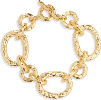 A hammered finish ensures this 24-karat gold-plated bracelet catches light from every angle.