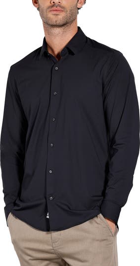 Long-sleeve slim shirt in textured nylon-spandex knit. Features UV protection, anti-odor tech, and button closure.