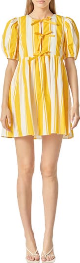 Bold vertical stripes mark an ultrasweet babydoll minidress detailed with dainty accents like a trio of bows at the bodice and billowy puffed sleeves.