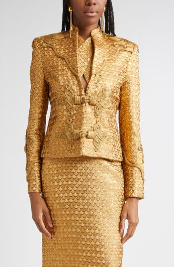 Ortiz's fall '25 collection drips with the opulence of the art deco era, as exemplified by this lookbook-featured blazer tailored in metallic-golden scale jacquard.