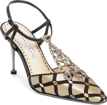 Manolo pays homage to the iconic photography of Irving Penn with this pointy-toe pump crafted from sleek satin covered in intricate lace and detailed with sparkling crystals.